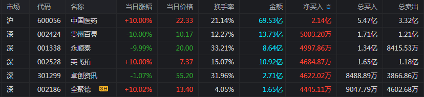 ②贵州百灵(002424),资金净额买入5003万元,所属板块:中药。上榜原因:日跌幅偏离值达7%的证券。公司现已是贵州省新医药产业骨干企业和全国最大的苗药研制生产企业。2021年,由米内网组织中国医药工业百强排行榜专家委员会评选产生的“2020年度中国医药工业百强系列榜单”颁布,公司荣登中国中药企业TOP100排行榜,位列第30位。中国非处方药物协会公布了“2021年度非处方药企业及产品榜”,贵州百灵入选“2021年度中国非处方药生产企业榜”前二十强,位于第18位,同时,公司产品咳速停糖浆/胶囊,金感胶囊,维C银翘片,双羊喉痹通颗粒及小儿柴桂退热颗粒等多款产品稳居各类别产品榜前列,排名持续上升。