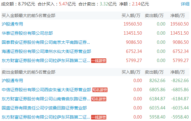 12月19日龙虎榜资金数据分析,龙虎榜资金净买入前五分别是中国医药、贵州百灵、永顺泰、英飞拓、卓创资讯,资金分别净买入2.14亿元、5003万元、4997万元、4622万元、4445万元,龙虎榜资金榜首是医药商业板块个股中国医药。