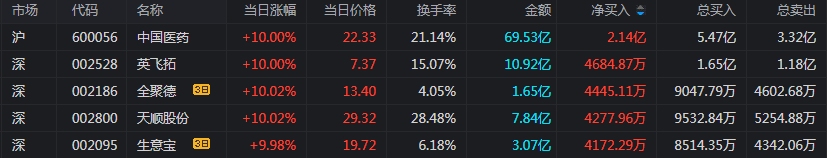 今日龙虎榜风口资金中前五只股票涨停。中国医药(医药商业)得到量化基金和作手新一游资的关注;英飞拓(计算机设备)得到北京中关村和杭州帮游资的关注;全聚德(酒店及餐饮)得到佛山系和量化基金游资的关注;天顺股份(物流)得到新生代游资的关注;生意宝(传媒)得到赵老哥和杭州帮游资的关注。