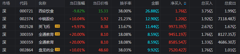 12月23日龙虎榜资金数据分析,龙虎榜资金净买入前五分别是西安饮食、中锐股份、英飞拓、全通教育、盘龙药业,资金分别净买入1.76亿元、1.20亿元、9973万元、9451万元、7520万元,龙虎榜资金榜首是酒店及餐饮板块个股西安饮食。
