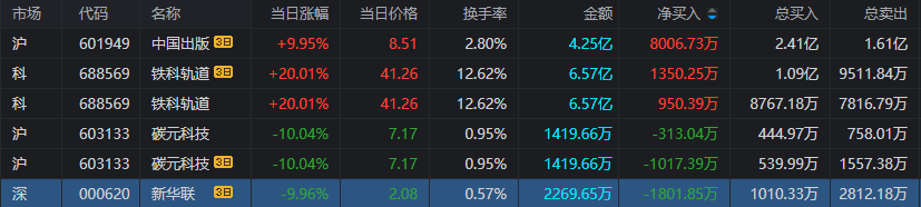 ③中国科传(601858),净额买入2.59亿元,所属板块:传媒。上榜原因:连续三个交易日内,涨幅偏离值累计达20%的证券。1、公司是中科院控股隶属央企,是目前国内拥有科技图书和期刊内容资源最多的出版单位之一,也是国内学科分布最全、出版规模最大的综合性科技出版机构;公司持股万方数据15%股份,万方数据库是与知网齐名的学术数据库。2、公司的主营业务包括图书出版业务、期刊业务、出版物进出口业务和知识服务业务等。其主要产品包括图书出版业务、期刊业务、出版物进口。3、公司实控人为中国科学院控股有限公司,在数字教育云服务方面,公司以数字教材、配套资源为基础,积极开拓在线教育业务,公司“中科云教育平台”服务广大高等院校师生,提供在线教学、在线考试、在线观看视频等服务。4、公司参股的深圳市迪威码半导体有限公司从事半导体集成电路芯片、计算机软硬件自主研发。