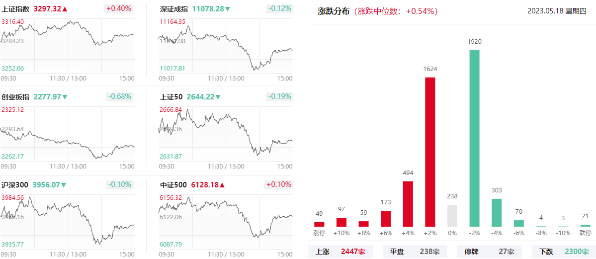 沪指今日冲高回落,创业板指午后一度跌超1%,黄白二线大幅分化。AI概念股集体反弹,CPO方向新易盛、中际旭创、剑桥科技、华工科技涨停,天孚通信、太辰光涨超10%,ChatGPT概念股中,拓尔思20cm涨停,宝兰德、同花顺涨超10%,算力方向,海光信息、中科曙光涨超6%。机器人概念掀涨停潮,丰立智能、远大智能、卓翼科技、中大力德、鸣志电器等十余股涨停,机器人、昊志机电、中威电子、赛为智能等多股涨超10%。板块概念方面,CPO、光通信、减速器、AIGC等板块涨幅居前,大消费、光伏胶膜、转基因、虚拟电厂等板块跌幅居前。两市总成交额8799亿元,较上个交易日放量985亿。总体上个股上涨和下跌家数基本相当。个股情绪方面,两市个股涨跌对比2447:2300,涨停跌停个股对比49:21,9只股票炸板,炸板率20%,北向资金净卖出18亿元。盘面上,大盘全天走势分化,沪指小幅反弹,创业板指震荡调整。今日AI与中特估两大主线均获资金修复,其中AI方向更是迎来强势反弹,作为前期市场核心主线,依旧保有较高市场人气。但需注意的是,AI板块在此前回调整理的过程中累积了不小的套牢卖压,结合当前市场仍以震荡轮动格局为主,AI板块整体想要再度开启新一轮上涨行情的难度依旧不低,在今日集体爆发后,板块内部的个股或将再度分化,后续可重点留意上涨趋势保持相对完好,上方套牢筹码相对较少的个股性机会。