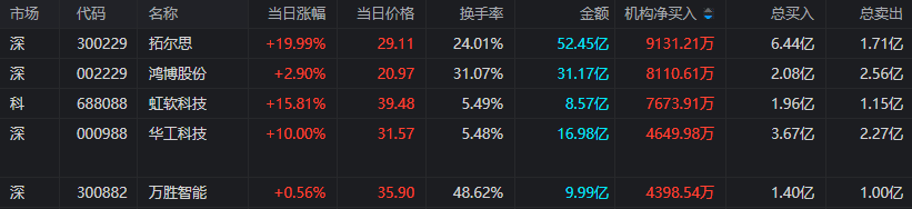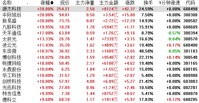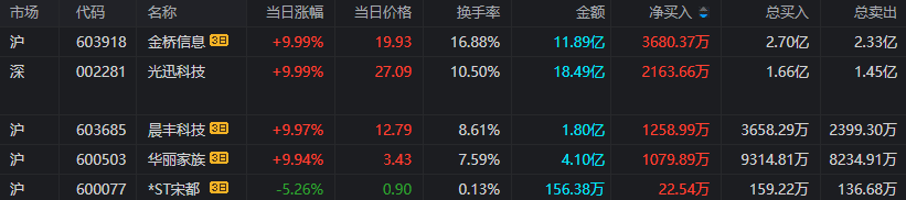 今日龙虎榜风口资金中前五只股票中前四只股票涨停。金桥信息(计算机应用)得到华鑫宁波分游资的关注;光迅科技(通信设备)得到一线游资的关注;晨丰科技(光学光电子)得到量化基金和瑞鹤仙游资的关注;华丽家族(房地产开发)得到量化基金游资的关注;*ST宋都(房地产开发)得到炒新一族和欢乐海岸游资的关注。
