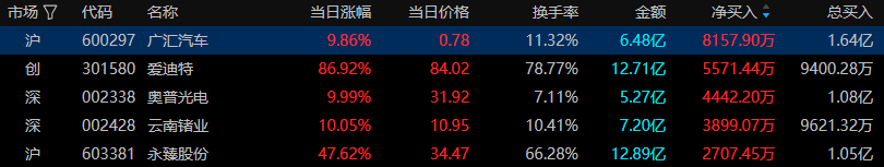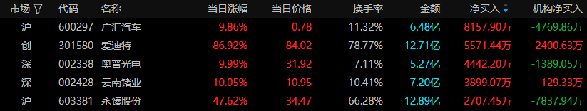 6月26日龙虎榜资金数据分析,龙虎榜资金净买入前五分别是广汇汽车、爱迪特、奥普光电、云南锗业、永臻股份,资金分别净买入8157万元、5571万元、4442万元、3899万元、2707万元,龙虎榜资金榜首是汽车服务板块个股广汇汽车。