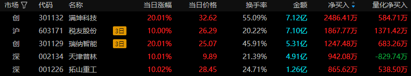 今日龙虎榜风口资金中上榜前五只股票全部涨停。满坤科技(半导体及元件)得到量化基金和上塘路游资的关注;税友股份(计算机应用)得到量化基金和一线游资的关注;瑞纳智能(仪器仪表)得到量化打板和知名游资的关注;天津普林(半导体及元件)得到上塘路和苏南帮游资的关注;拓山重工(专用设备)得到量化打板和金田路游资的关注。