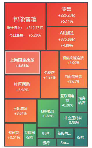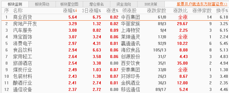 板块方面:多数收涨,商业百货、房地产开发、珠宝首饰、消费电子、汽车服务、食品饮料、家用轻工、旅游酒店、煤炭行业、酿酒行业涨幅居前,保险板块跌幅居前。