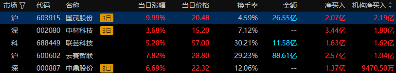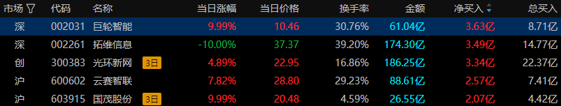 今日龙虎榜风口资金中上榜前五只股票中两只涨停。巨轮智能(专用设备)得到消闲派游资的关注;拓维信息(软件开发)得到交易猿和宁波桑田路游资的关注;光环新网(通信服务)得到量化基金游资的关注;云赛智联(软件开发)得到作手新一、徐晓和量化基金游资的关注;国茂股份(通用设备)得到孙哥和量化基金游资的关注。
