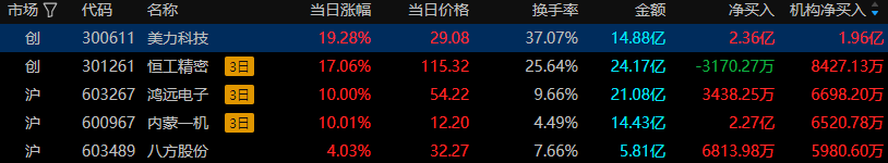 3)美力科技(300611),净额买入2.36亿元,所属板块:汽车零部件。上榜原因:有价格涨跌幅限制的日换手率达到30%的证券;有价格涨跌幅限制的日收盘价格涨幅达到15%的证券。股价异动:美力科技今日以19.28%的涨幅收盘,表现强劲,成功登上龙虎榜。近期,该股在市场上表现活跃,主要受益于汽车行业的利好政策推动。公司作为汽车零部件行业的参与者,得益于行业的稳步增长,其产品需求随之增加。此外,公司在管理和品牌方面的优势也为其市场表现提供了支撑。在今日的龙虎榜资金中,机构专用大举买入,游资短线操作显著。从龙虎榜数据来看,量化打板等游资席位积极参与,显示出短线资金对该股的关注。虽然部分席位如财通证券新昌江滨西路表现出一定的抛压,但整体上游资的净买入对股价形成支撑。游资的操作风格偏向于短线套利,这可能对股价造成一定的波动。
