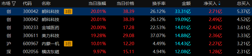 今日龙虎榜风口资金中上榜前五只股票中四只涨停。朗科科技(计算机设备)得到粉葛游资的关注;金城医药(化学制药)得到成都系游资的关注;美力科技(汽车零部件)得到量化打板和T王游资的关注;内蒙一机(军工装备)得到量化打板和山东帮游资的关注;横店东磁(光伏设备)得到量化打板、温州帮和T王游资的关注。
