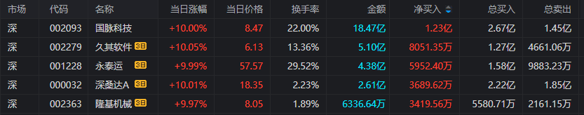 今日龙虎榜风口资金中前五只股票全部涨停。国脉科技(教育)得到交易猿和作手新一的关注;久其软件(计算机应用)得到知名游资的关注。永泰运(物流)得到量化基金和一线游资的关注;深桑达A(建筑装饰)得到上海溧阳路和佛山系游资的关注;隆基机械(汽车零部件)得到游资的关注。