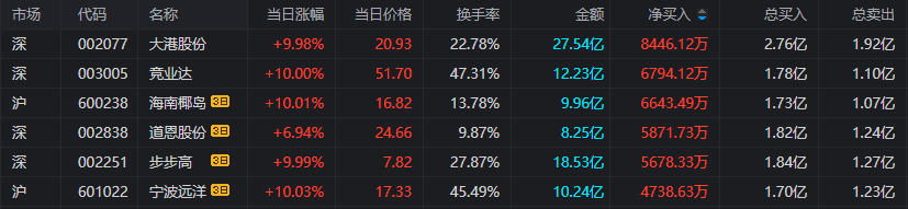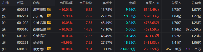 ③海南椰岛(600238),净额买入6643万元,所属板块:饮料制造。上榜原因:连续三个交易日内,涨幅偏离值累计达20%的证券。1、公司主营业务为酒类产品的生产和销售,主要产品有健康保健酒“椰岛鹿龟酒”与“椰岛海王酒”,白酒“海口大曲”与“椰岛原浆”等,同时公司布局椰汁类生态饮品和软饮料(非碳酸),并开展商品贸易与供应链业务协同发展。2、椰岛全球购定位于岛内居民消费品经营,跨境电商等业务。3、椰岛全球购是海南椰岛旗下专业跨境免税购物平台,线下广泛布局跨境门店,线上通过跨境电商搭建B2C平台及具备直采分销功能的B2B平台,线上跨境平台将以跨境商品为主,一般贸易产品为辅。4、海南椰岛实控人变更遭上交所问询:是否存在潜在利益安排或抽屉协议。近期,海南椰岛披露非公开发行股票预案,海南信唐贸易合伙企业(有限合伙)(以下简称海南信唐)拟出资6.54亿元,认购非公开发行股票8100万股,本次非公开发行股票完成后,公司实际控制人将由冯彪变更为王晓晴。