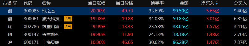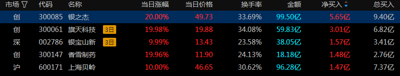 今日龙虎榜风口资金中上榜前五只股票全部涨停。银之杰(软件开发)得到陈小群、越王大道和消闲派游资的关注;旗天科技(文化传媒)得到呼家楼、消闲派路和炒新一族游资的关注;银宝山新(专用设备)得到量化打板和小鳄鱼游资的关注;香雪制药(中药)得到量化打板、消闲派和北京中关村游资的关注;上海贝岭(半导体)得到量化基金游资的关注。