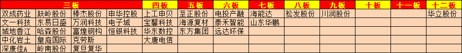 连板个股:今日连板股总数有83个(二连板不在表上),相比昨日增加41个,两市最高连板十二连板华立股份(建筑材料),连板股晋级率81.39%。个股方面,强势股继续抱团,双成药业27天24板、海能达23天19板、恒银科技21天13板、华立股份12连板、岩石股份23天12板、川润股份11天10板,短线市场依旧维持火爆的赚钱效应。但需注意的是,海能达、华立股份、川润股份都呈现出加速上涨的态势,而双成药业也是经历了剧烈换手后于尾盘再度上板。上述个股大多均累积了较大的获利卖压,一旦后续没有足够资金承接的话,不排除一致性过高而分歧的可能性。