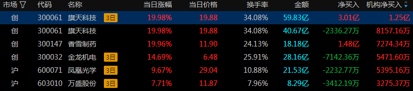2)旗天科技(300061),资金净额买入3.01亿元,所属板块:文化传媒。上榜原因:连续3个交易日内收盘价格涨幅较基准指数偏离值累计达到30%的证券。股价异动:1、2024年7月,公司拟募资不超4亿引入算力硬件企业七彩虹皓悦,交易完成后,公司控股股东将变更为七彩虹皓悦,旗下七彩虹为我国知名显卡品牌,市场或预期七彩虹借壳上市。2、公司继续夯实数字人民币营销推广领域的先发优势,扩大2层和2.5层银行覆盖度,联合银行推进多个数字人民币红包项目的对接和实施落地。3、子公司上海合晖保险是一家全国性、综合性的保险经纪公司,拥有全国性的保险经纪牌照和从事互联网保险业务的ICP电信增值业务许可证。4、公司持续推进移动政务平台项目拓展及运营深化,与各地政务平台合作。截至目前,已和长沙、海口、盐城等全国各城市的移动政务平台达成合作。5、七彩虹推出联名显卡:iGame RTX4080SUPER ADOC x黑神话:悟空DLSS3游戏光追显卡。