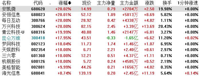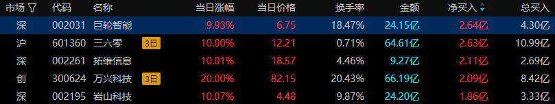 今日龙虎榜风口资金中上榜前五只股票中全部涨停。巨轮智能(专用设备)得到曲江池和消闲派的关注;三六零(软件开发)得到徐留胜和量化基金游资的关注;拓维信息(软件开发)得到成都系游资的关注;万兴科技(软件开发)得到量化基金游资的关注;岩山科技(IT服务)得到粉葛游资的关注。