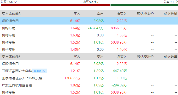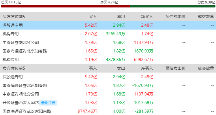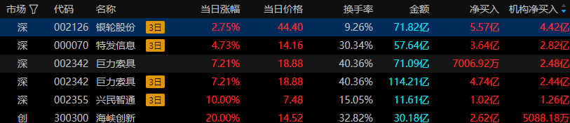 ②银轮股份(002126),资金净额买入5.57亿元,所属板块:汽车零部件。上榜原因:连续三个交易日内,涨幅偏离值累计达20%的证券。股价异动:银轮股份今日收涨2.75%,连续三日放量上攻,资金借“液冷+储能”题材轮动切入,叠加半年报净利同比增9.53%,情绪快速升温。在今日的龙虎榜资金中,机构净买4.42亿,深股通净买2.22亿。深股通与机构同步加仓,显示主流资金对中期成长逻辑的认可;国泰海通天台环城东路、广发杭州富春路等短线席位兑现利润,风格偏波段止盈。量化打板虽有卖出,但金额有限,更多体现T+0套利而非趋势反转。机构锁仓叠加深股通持续流入,或强化股价韧性。