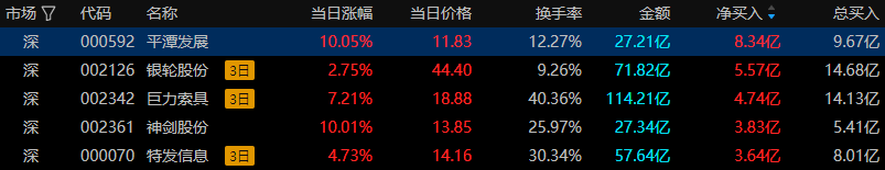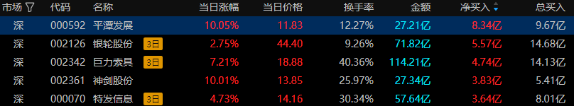 ①平潭发展(000592),今日拔得龙虎榜资金头筹,所属板块:种植业与林业,资金净额买入8.34亿元,机构买入明显。上榜原因:日涨幅偏离值达7%的证券。股价异动:平潭发展今日涨停。公司注册地位于平潭综合实验区,国务院将其开放开发上升为国家战略,叠加与福建农林大学合作的菌草纤维板项目及“林板一体化”产业链升级,形成绿色新材料与两岸合作双重催化,成为资金聚焦的核心逻辑。在今日的龙虎榜资金中,国泰海通武汉紫阳东路净买入3.82亿,章盟主跟进1.12亿。章盟主以重仓出击主升浪著称,今日携近1.1亿元进场,或意在短线加速;国泰海通三家营业部合计净买入近7亿元,同步打板风格明显,短期对股价形成强推力。深股通与国信浙江互联网分公司等资金逢高兑现,显示部分资金选择落袋,短期波动或加剧。