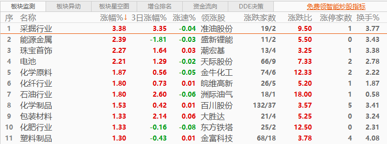 板块方面:涨跌互现,采掘行业、能源金属、电池、珠宝首饰、化学原料板块涨幅居前,商业百货、酿酒行业、旅游酒店、航天航空板块跌幅居前。
