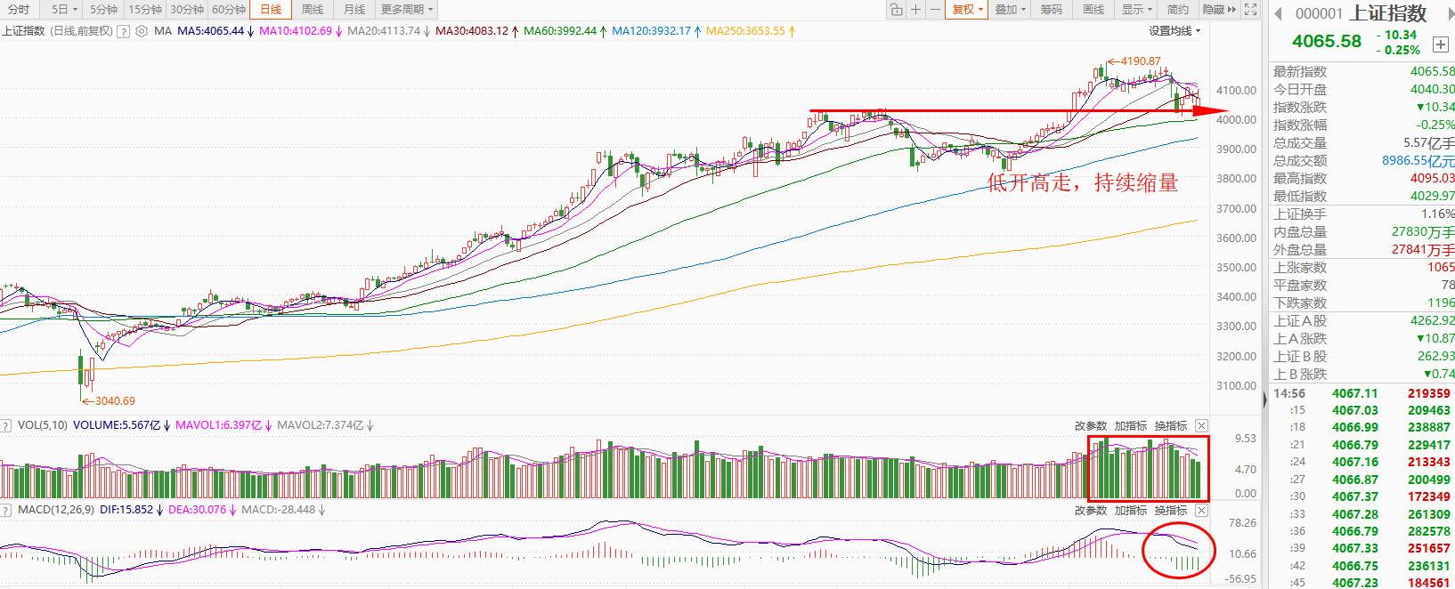 上证指数早盘大幅低开,随后震荡上涨,午后冲高后小幅回落,截止收盘,指数下跌0.25%,收出假小阳线,全天成交额8987亿,相比上交易日的9470亿,减少了483亿。