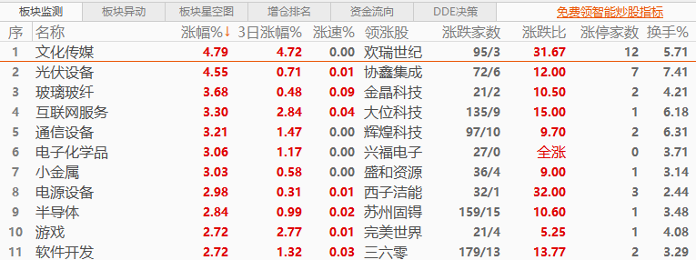 板块方面:几乎全线上扬,文化传媒、光伏设备、玻璃玻纤、互联网服务、通信设备、电子化学品、小金属、电源设备、半导体板块涨幅居前,仅采掘行业与燃气板块逆市下跌。