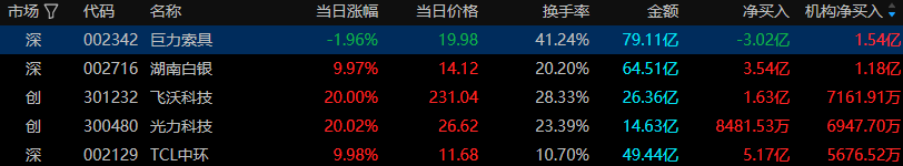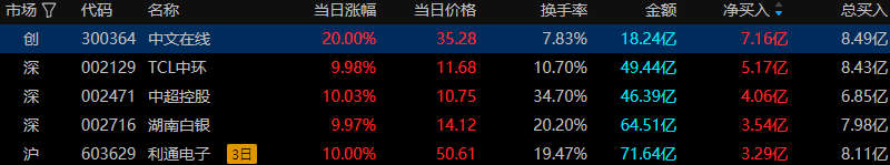 今日龙虎榜风口资金中上榜前五只股票全部涨停。中文在线(文化传媒)得到成都系游资的关注;TCL中环(光伏设备)得到量化打板和T王资的关注;中超控股(电网设备)得到量化打板游资的关注;湖南白银(贵金属)得到T王游资的关注;利通电子(消费电子)得到量化基金游资的关注。