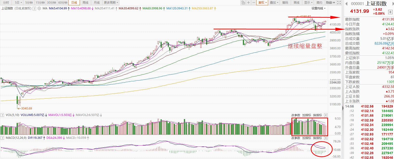 上证指数早盘小幅低开,随后震荡走高,午后小幅回落,截止收盘,指数上涨0.09,收出十字线,全天成交额8226亿,相比上交易日的8822亿,减少了596亿。