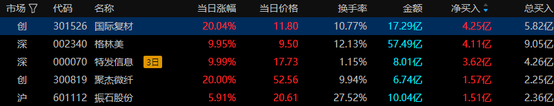 今日龙虎榜风口资金中上榜前五只股票中四只涨停。国际复材(建筑材料)得到量化打板、量化基金、中山东路和成都系游资的关注;格林美(电池)得到量化打板和成都系资的关注;特发信息(通信设备)得到量化打板和成都系游资的关注;聚杰微纤(纺织制造)得到章盟主游资的关注;振石股份(建筑材料)得到量化基金游资的关注。