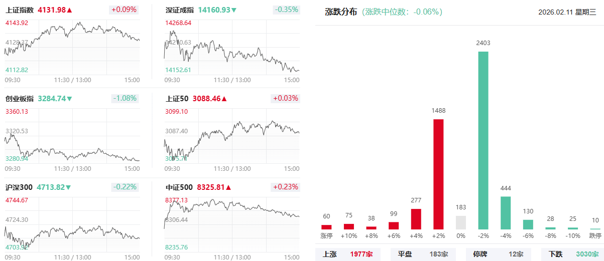市场全天震荡分化,创业板指跌超1%。玻纤概念股集体大涨,山东玻纤、中国巨石等多股涨停。有色金属板块走强,中钨高新、翔鹭钨业等涨停。化工股反复活跃,华尔泰、吉华集团等涨停。下跌方面,影视概念股调整,横店影视、金逸影视等跌停。板块概念方面,玻纤、有色金属、化工、锂矿等板块涨幅居前,影视传媒、AI应用、旅游、CPO等板块跌幅居前。沪深两市今日成交额1.98万亿,时隔31个交易日,沪深两市成交额跌破2万亿,较上一个交易日缩量1213亿。个股情绪方面,两市个股涨跌对比1977:3030,涨停跌停个股对比60:10。盘面上,市场延续分化态势,三大指数涨跌不一,沪指小幅收涨,创业板指则跌超1%。而量能进一步萎缩,两市成交额已不足2万亿。不过这主要是受长假期间海外不确定性及春节取现需求上升等因素影响,节后资金通常回流,市场风险偏好也有望明显修复。站在盘面的维度,板块维持快速轮动态势,沉寂多日的周期股今日集体爆发,化工、有色等方向获得资金回流,而昨日最为火爆的传媒娱乐板块则全线调整。但正如昨日强调的,市场主要的热门赛道,虽延续性一般,但均未出现明显退潮的信号,预计在后市轮动中仍存在反复活跃的机会。因此在目前市场环境下,利用短线调整寻找低吸布局机会或更高之胜率。