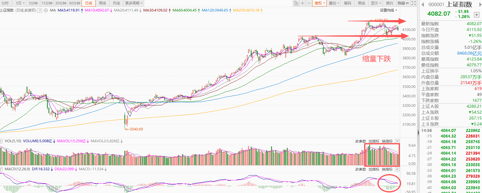 上证指数早盘小幅低开,随后震荡调整,午后跌幅扩大,截止收盘,指数下跌1.26%,收出中阴线,全天成交额8468亿,相比上交易日的8980亿,减少了512亿。