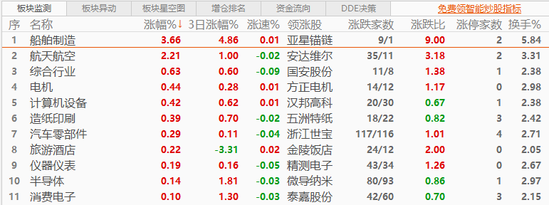 板块方面:涨少跌多,船舶制造与航天航空板块逆市走强,光伏设备、小金属、玻璃玻纤、航运港口、钢铁行业、采掘行业、贵金属、能源金属板块跌幅居前。