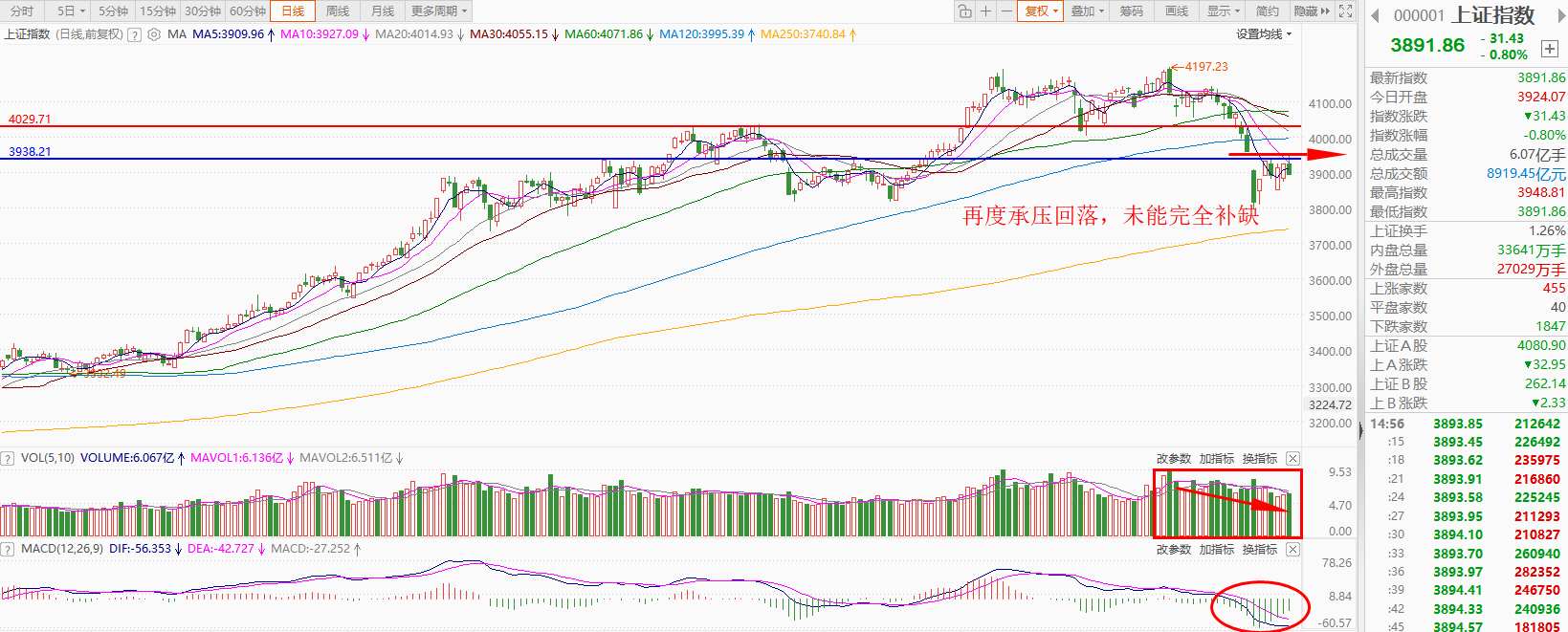 上证指数早盘几乎平开,随后冲高回落,午后震荡调整,截止收盘,指数下跌0.80%,收出小阴线,全天成交额8919亿,相比上交易日的8398亿,增加了521亿。