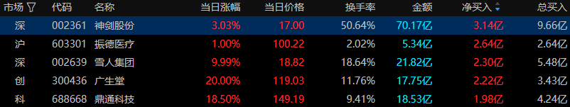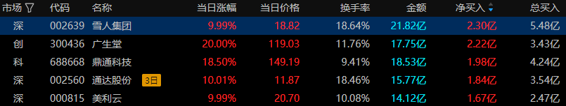 今日龙虎榜风口资金中上榜前五只股票中四只涨停。雪人集团(通用设备)得到量化打板和成都系游资的关注;广生堂(化学制药)得到成都系和T王资金的关注;鼎通科技(通信设备)得到量化基金游资的关注;通达股份(电网设备)得到量化打板、温州帮和屠文斌游资的关注;美利云(通信服务)得到量化打板和T王游资的关注。