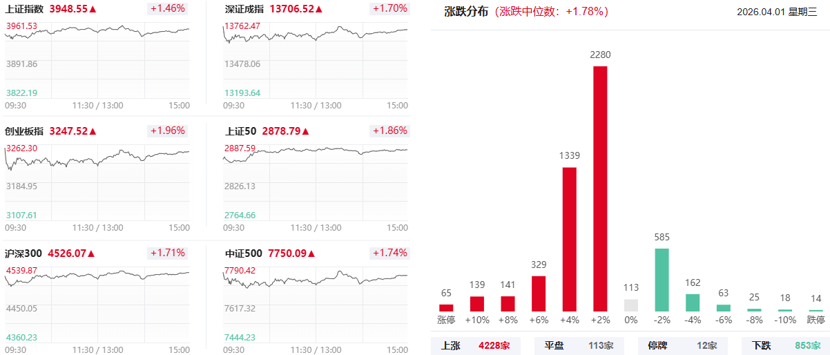 亚商投顾-4月1日龙虎榜复盘:三大指数均涨超1% 全市场近4500只个股上涨