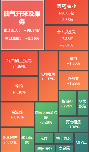 板块方面:多数收跌,石油石化、医药商业、能源金属板块涨幅居前,贵金属、元件、通信服务、小金属、半导体、广告营销、玻璃玻纤板块跌幅居前。