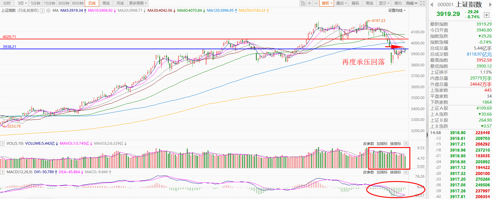 上证指数早盘小幅低开,随后震荡调整,午后再度下跌,截止收盘,指数下跌0.74%,收出小阴线,全天成交额8119亿,相比上交易日的8973亿,减少了854亿。
