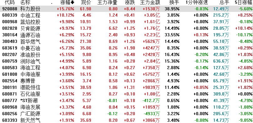 板块上,油气股再度走强,贝肯能源、蓝焰控股涨停,通源石油、中曼石油、洲际油气等跟涨。消息面上,布伦特原油重新站上106美元/桶,日内近5%。WTI原油站上104美元/桶,日内涨超3%。国金期货表示,短期来看,原油市场预计维持震荡偏强格局。在偏多氛围支撑下,国内原油期货价格维持震荡上行的走势,预计短期内国内原油期货或维持震荡偏强的格局。