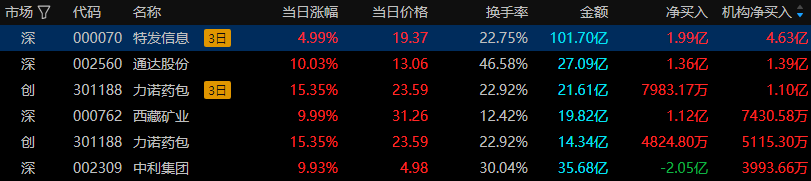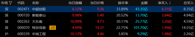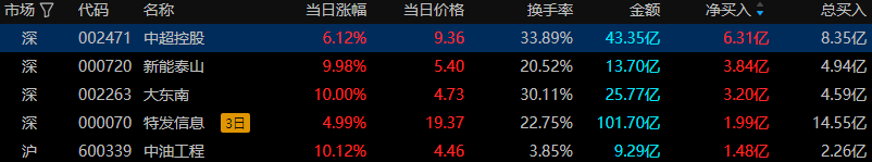 今日龙虎榜风口资金中上榜前五只股票中三只涨停。中超控股(电网设备)得到量化打板和T王游资的关注;新能泰山(电网设备)得到成都系、佛山系、量化打板和T王资金的关注;大东南(塑料制品)得到宁波桑田路、量化打板和T王游资的关注;特发信息(通信设备)得到成都系游资的关注;中油工程(油气开采及服务)得到量化打板和量化基金游资的关注。