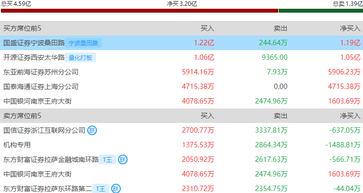 ③大东南(002263),净额买入3.20亿元,所属板块:塑料制品。上榜原因:日涨幅偏离值达7%的证券;日换手率达20%的证券。股价异动:大东南今日涨停,个股走出6天4板。公司互动易连续释放高端电容膜技术突破、特高压订单饱满、光伏背板膜放量等利好,叠加第一大股东筹划股权转让带来的控制权变更预期,资金将其视为算电协同与国资改革双主题共振标的,短线情绪快速升温。在今日的龙虎榜资金中,宁波桑田路1.19亿打板,量化打板1.05亿同步扫货。宁波桑田路以彪悍打板风格闻名,历史偏好锁仓做T或隔日快速兑现,今日重金进场短线加速;量化打板同步亿元级扫货,程序化封板进一步压缩抛压。两者合力将股价推至阶段新高,短线资金博弈升温。T王虽小幅净卖出,但金额有限,更多体现散户逢高兑现情绪,暂未形成集中抛压。