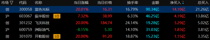 今日龙虎榜风口资金中上榜前五只股票中三只涨停。蓝色光标(文化传媒)得到章盟主和温州帮游资的关注;振华股份(化学原料)得到量化基金资金的关注;飞沃科技(风电设备)得到佛山系和量化打板游资的关注;洲际油气(油气开采及服务)得到量化基金游资的关注;开勒股份(通用设备)得到量化打板和量化基金游资的关注。