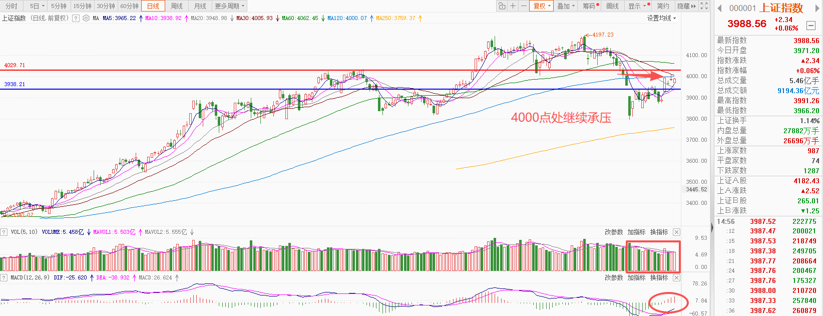 上证指数早盘小幅低开,随后冲高回落,午后小幅拉升,截止收盘,指数上涨0.06%,收出小阳线,全天成交额9194亿,相比上交易日的9557亿,减少了363亿。